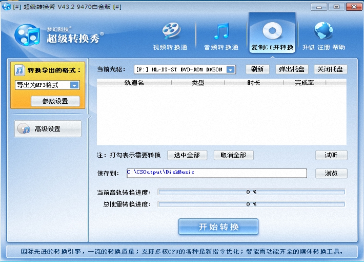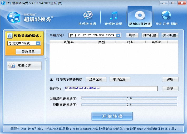 超级变换秀是国内首款集成视频变换、音频变换、CD抓轨、音视频混合变换、音视频切开/驳接变换、叠加视频水印、叠加翻滚字幕/特性文字/图像、叠加视频相框等于一体的较优秀的音频转换器。